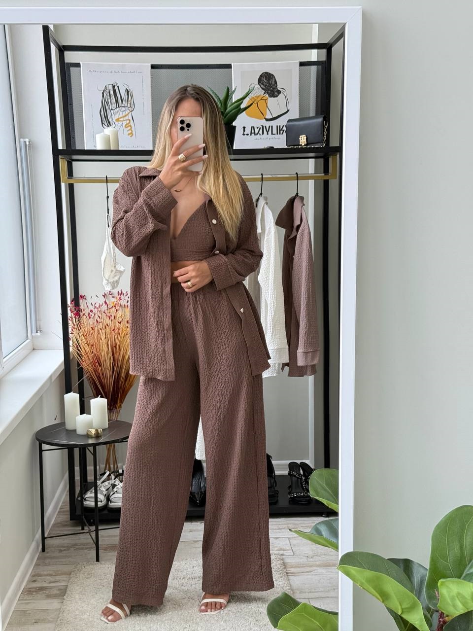 Головна » Магазин » ОДЕЖДА » ЖЕНСКИЕ КОСТЮМЫ » Костюм тройка (топ+брюки свободного кроя+рубашка с длинным рукавом) шоколад