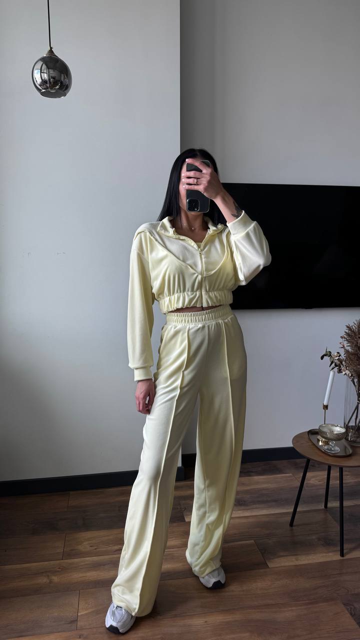 Очень крутой и комфортный костюм тройка состоящий из тощи, брюк и топа. Костюм создан из плотной ткани, которая обеспечивает комфорт и удобство.