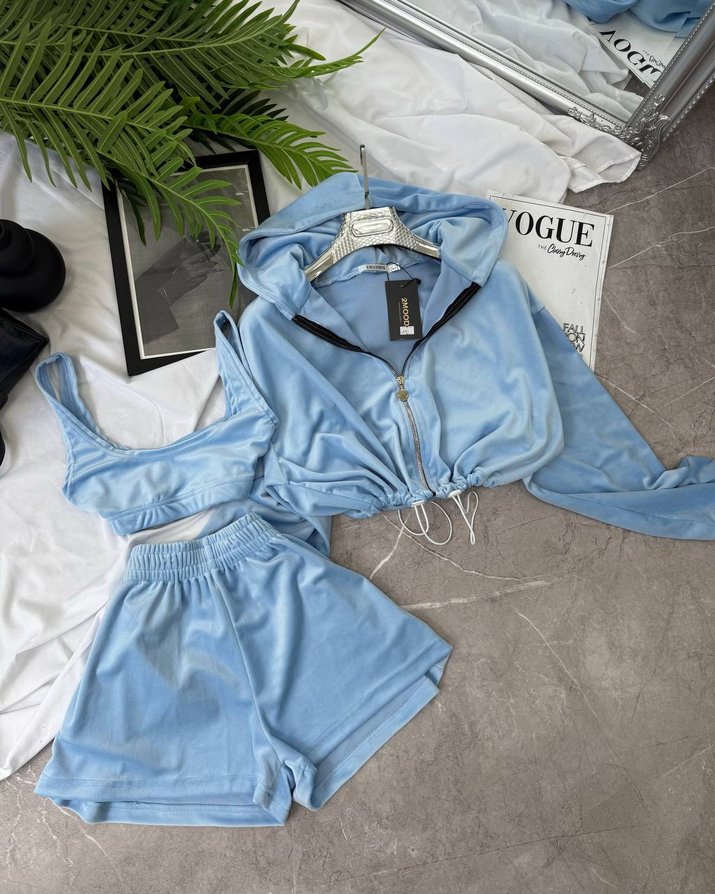 Костюм тройка, который не захочется снимать с себя! Из кофты, топа и шорт – вещи, которые можно носить отдельно. Приятная мягкая к телу ткань. Кофта идет с капюшоном и фиксаторами снизу. Топ и шорты на резинке.