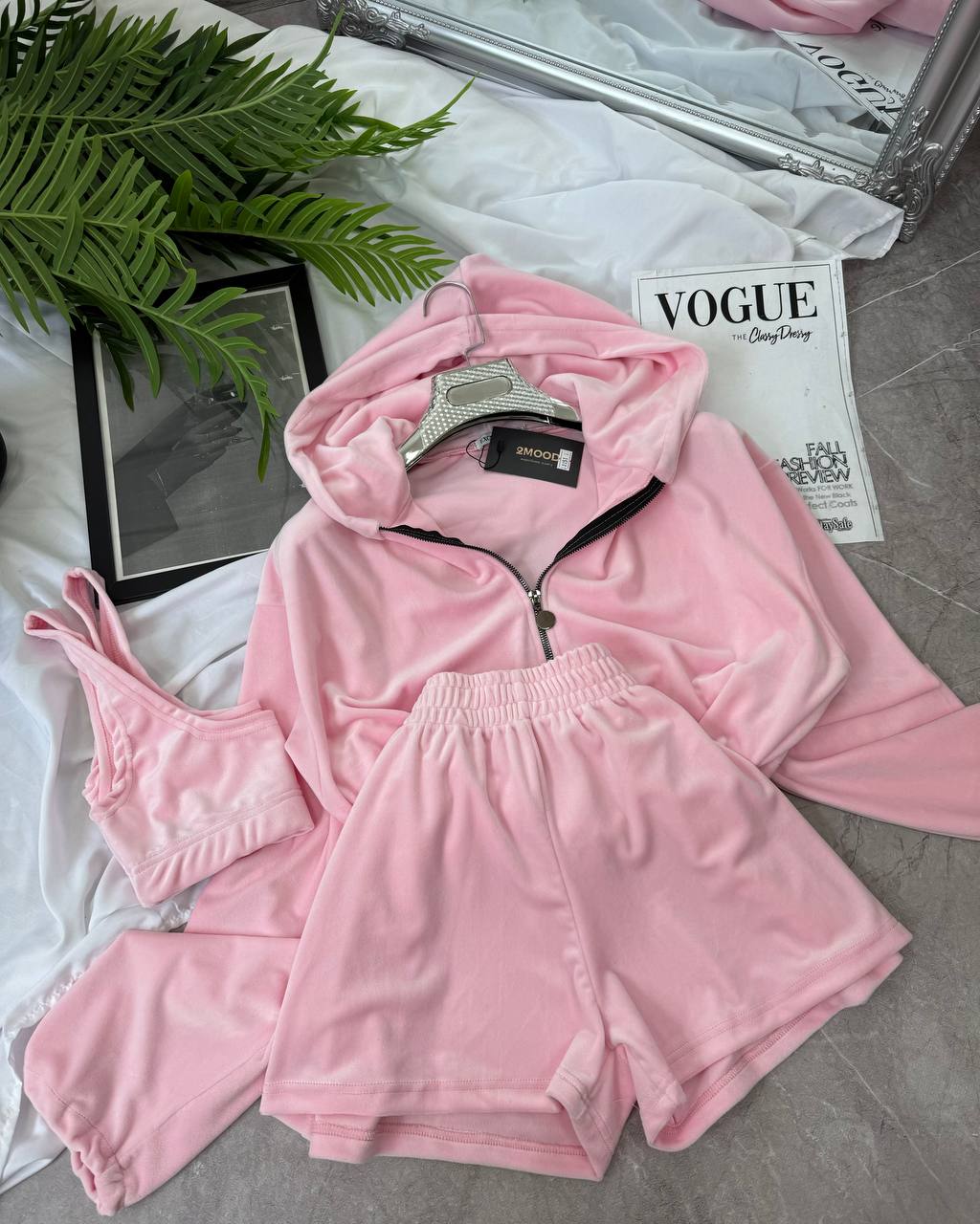 Костюм тройка велюровый: кофта, топ и шорты на резинке Барби