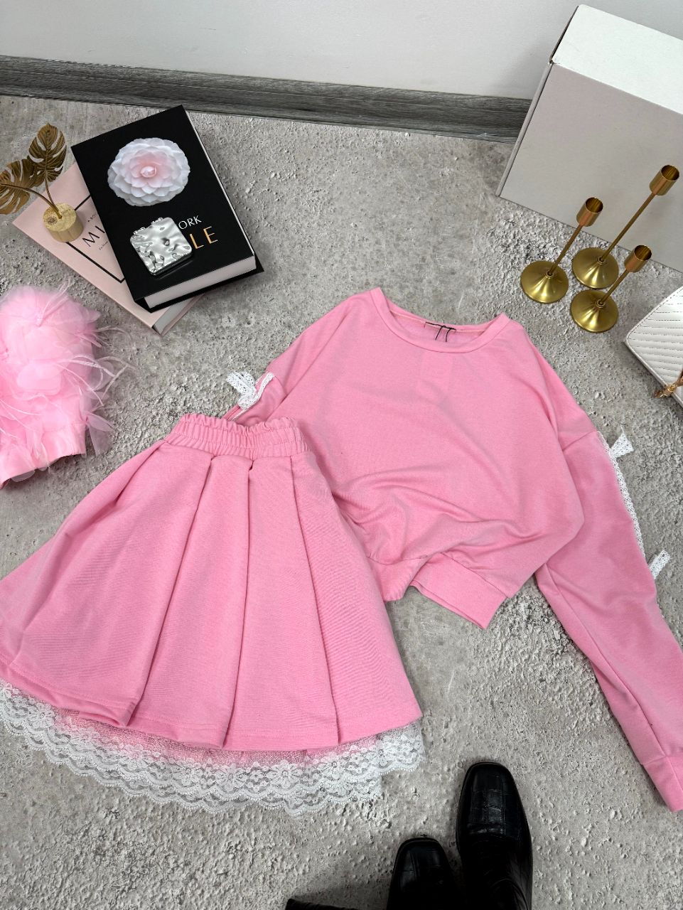 Костюм: юбка с кружевом + свитшот оверсайз розовый