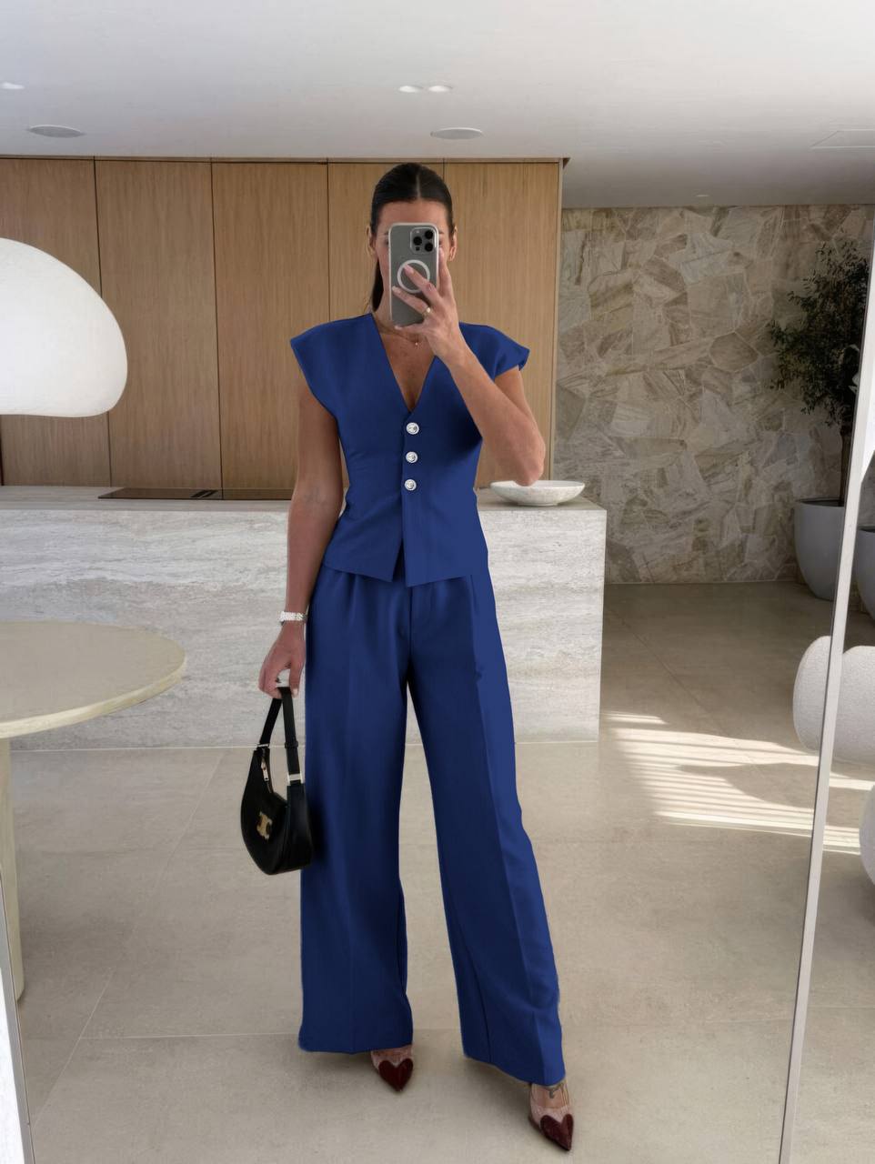 Костюм: жилетка приталенного кроя на пуговицах с V-образным вырезом+брюки с высокой посадкой синий