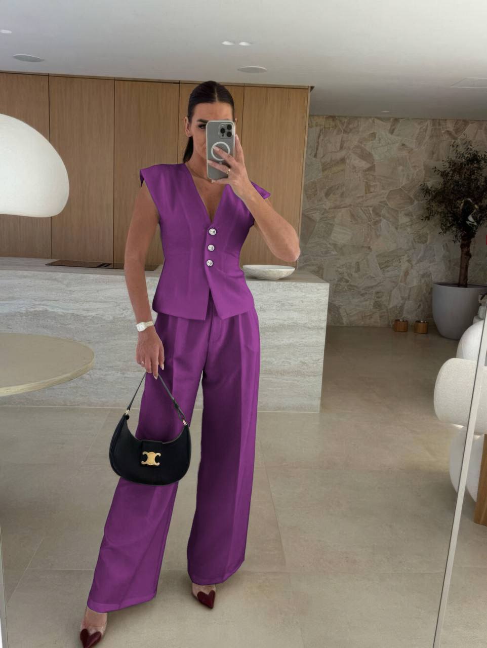 Костюм: жилетка приталенного кроя на пуговицах с V-образным вырезом+брюки с высокой посадкой фиолет