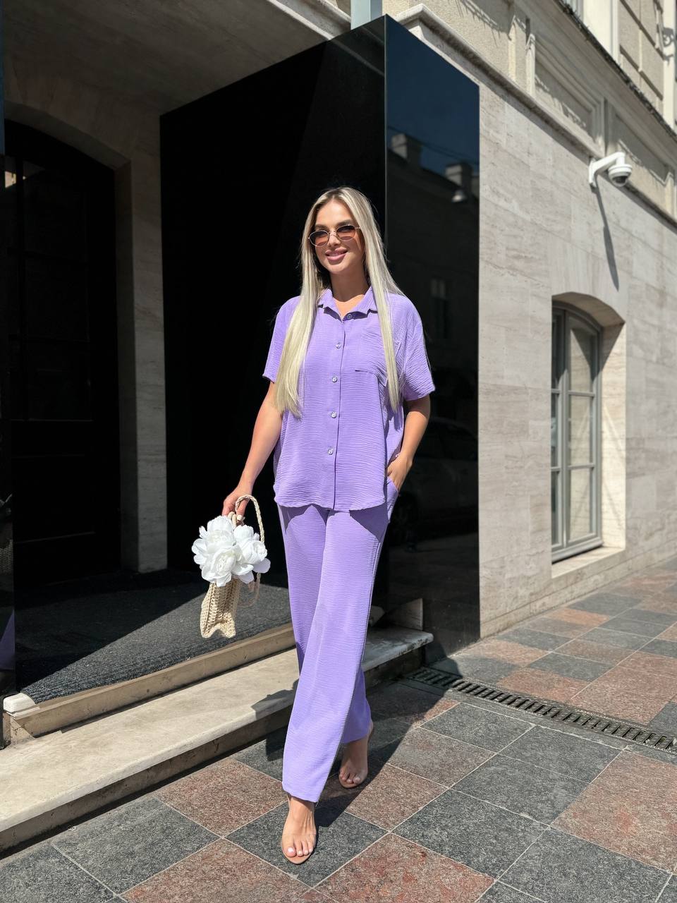 Костюм (брюки + рубашка и майка) Цвет: голубой, лаванда, пудра, малина, серый Ткань : креп жатка Размеры: S, M, L, XL