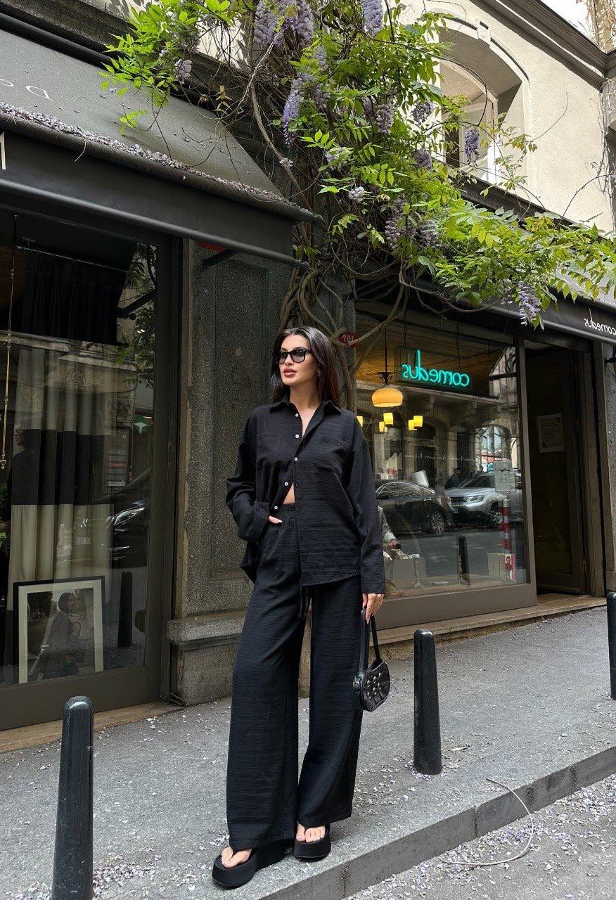 Легкий костюм из креп жатки (широкие брюки+рубашка) черный