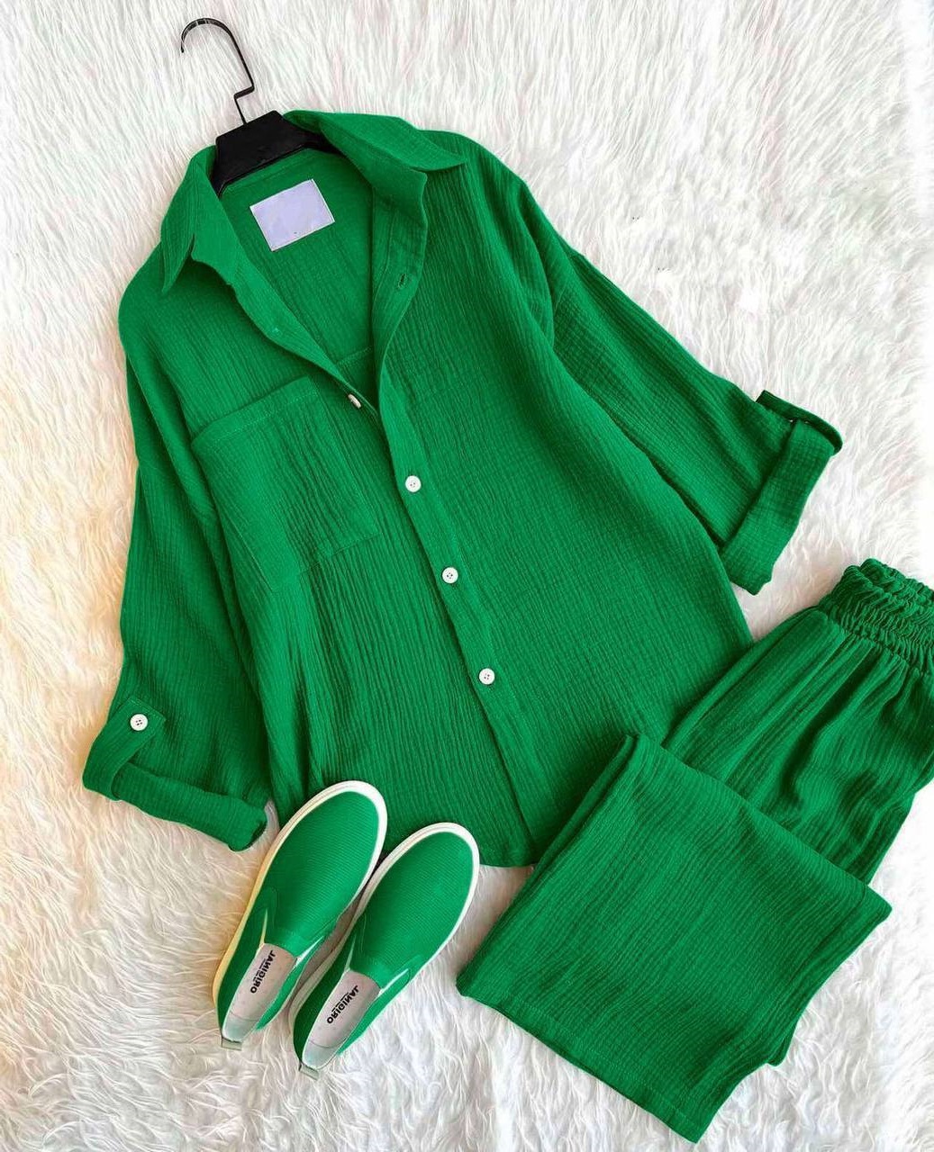 Головна » Магазин » ОДЕЖДА » ЖЕНСКИЕ КОСТЮМЫ » Легкий костюм рубашка+штаны с карманами трава