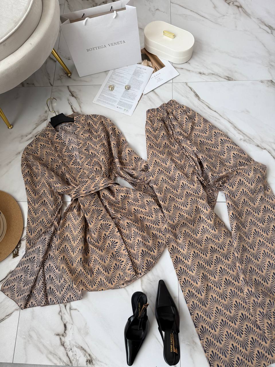 Легкий костюм: свободное кимоно с разрезами на рукавах и поясом и брюки шоколад