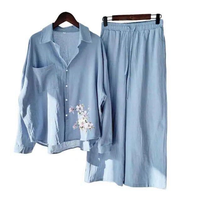Легкий льняной костюм (рубашка с накатом+свободные брюки) голубой
