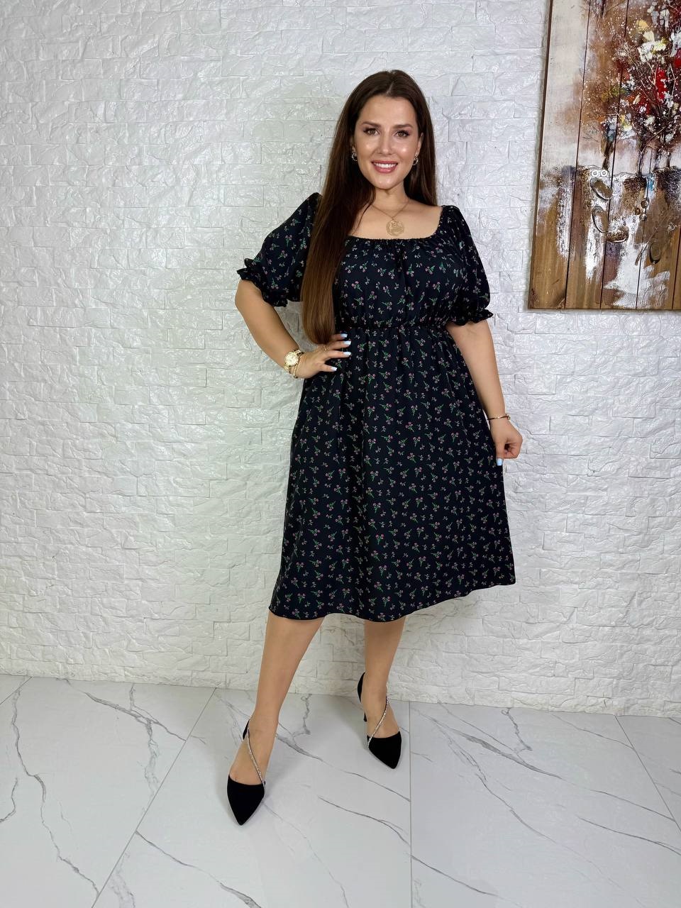 Легкое платье: плечи на резинке (можно спустить на плечи), талия и низ рукавов на резинке.