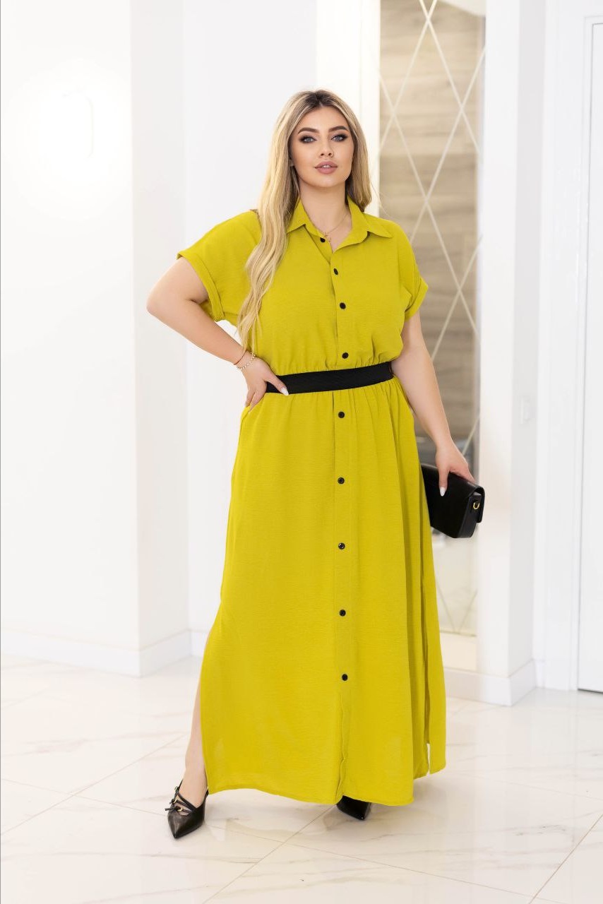 Легкое платье длиной макси со спущенным плечом+по талии эластичный пояс-резинка горчица