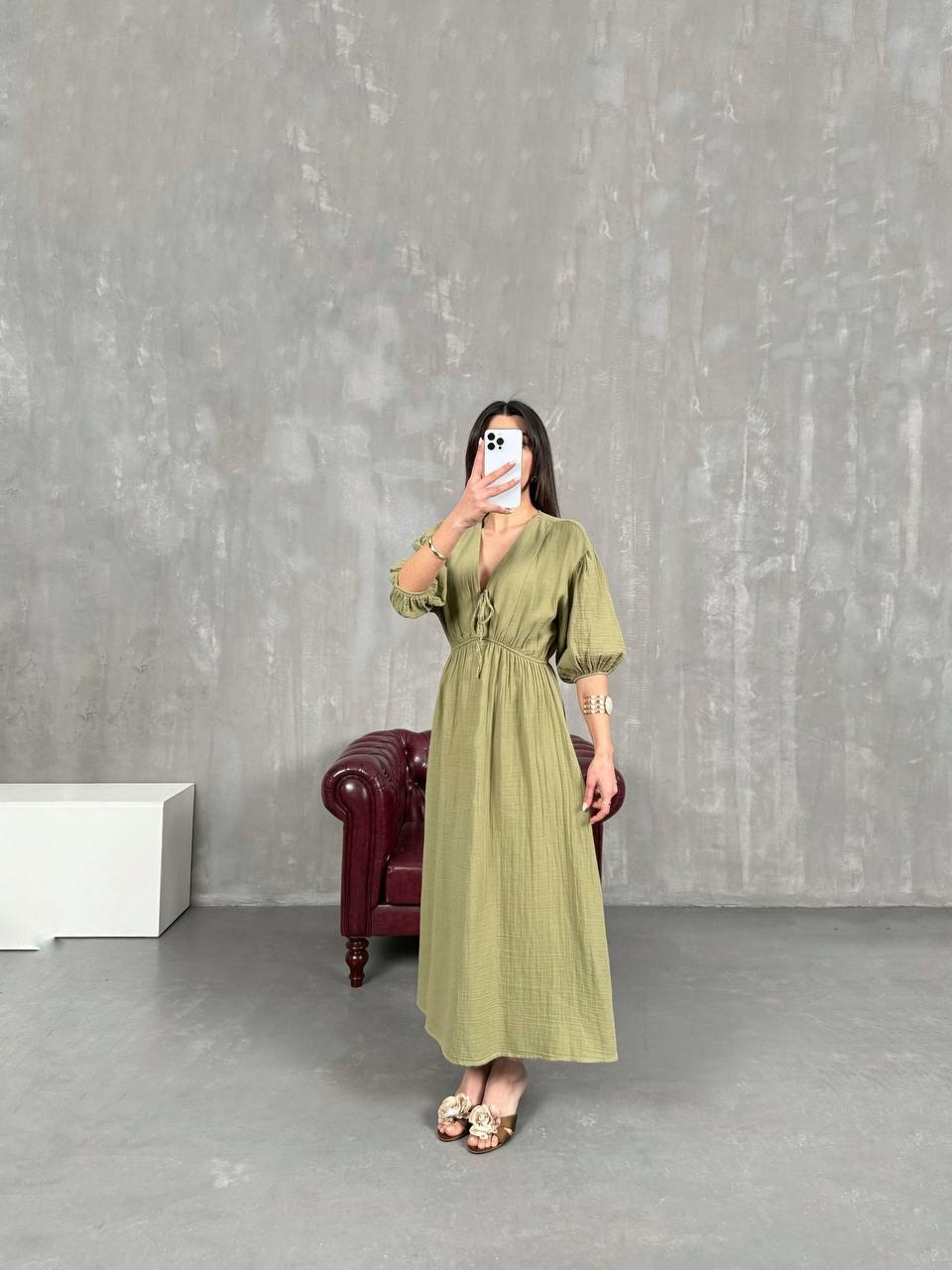 Легкое платье из муслина с пышными рукавами+расклешенной юбкой+талия на резинке олива