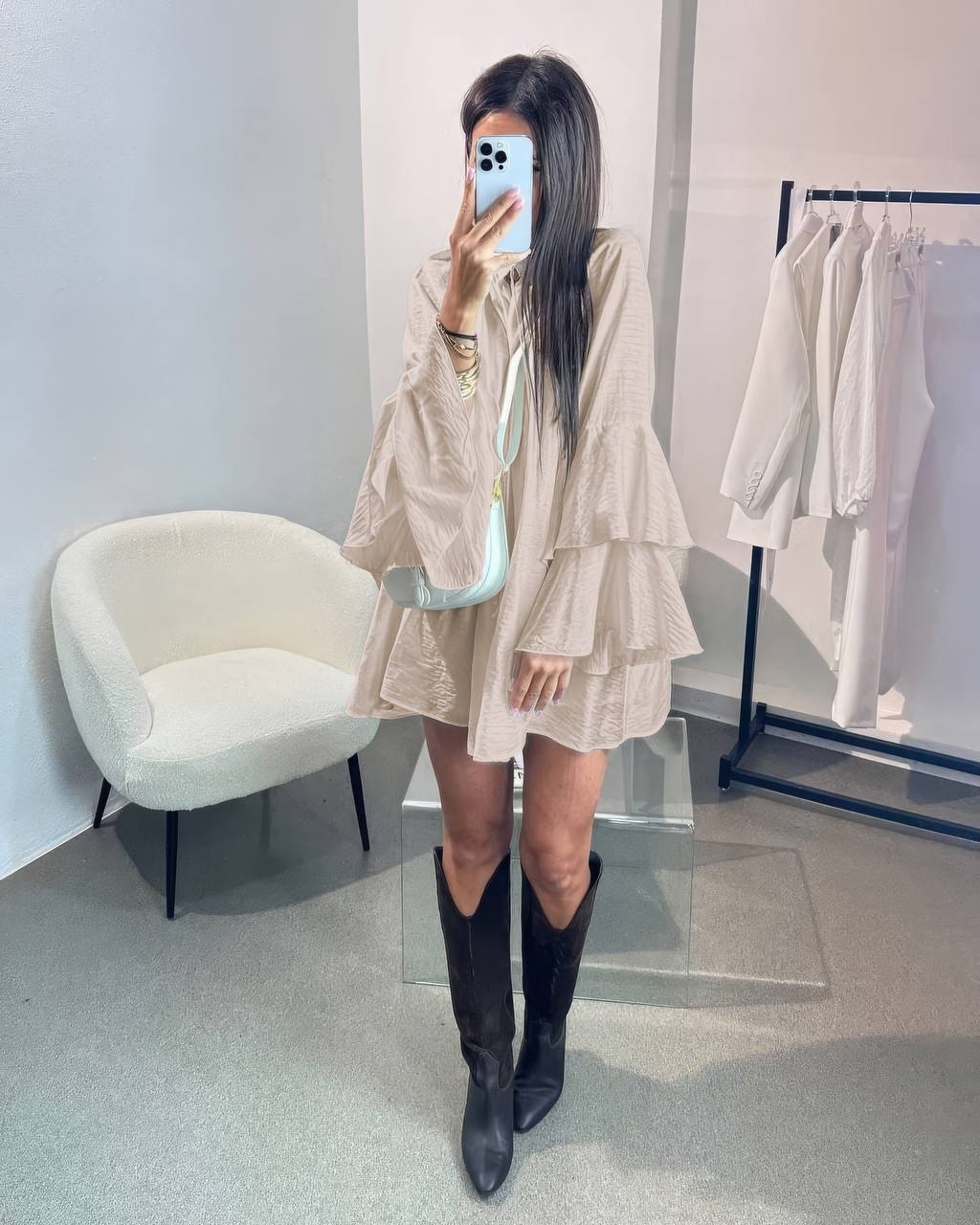 Легкое платье oversize с рукавами-воланами+поясом на талии бежевый