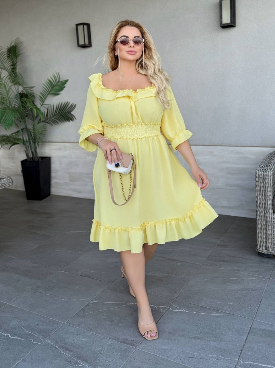 На груди резинка (можно спустить на плечи), рукава на резинке, по низу платья волан,