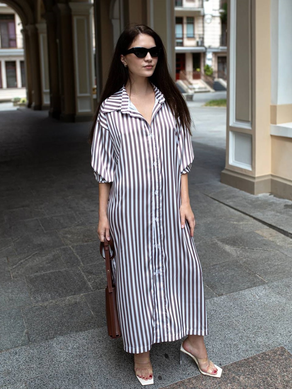 Легкое платье-рубашка свободного кроя на пуговицах принт полоска шоколад