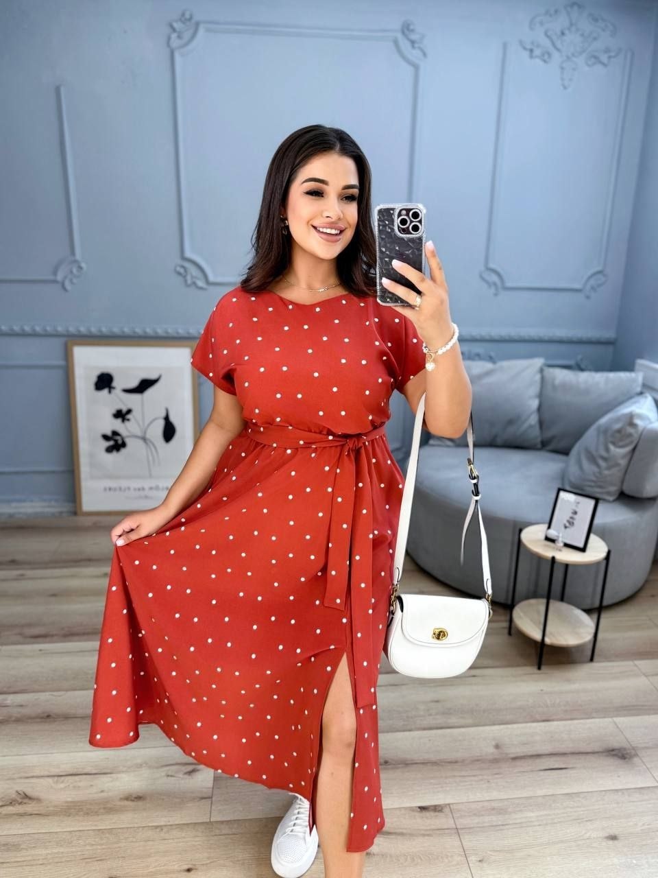 Легкое платье с цельнокройным рукавом с карманами+разрезами по талии резинка- красный горошек