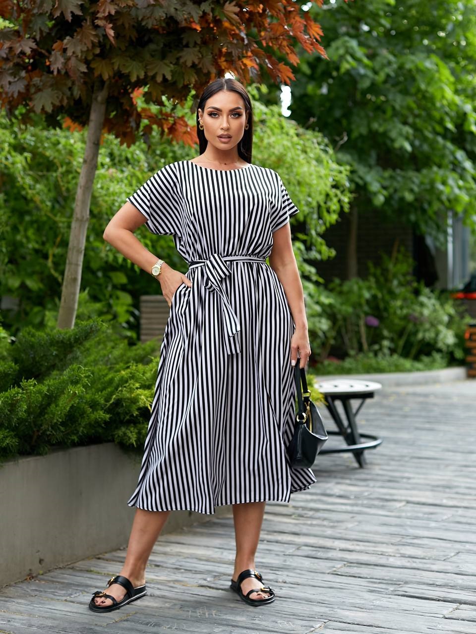 Легкое платье с цельнокройным рукавом с карманами+разрезами по талии резинка-белый в черную полоску