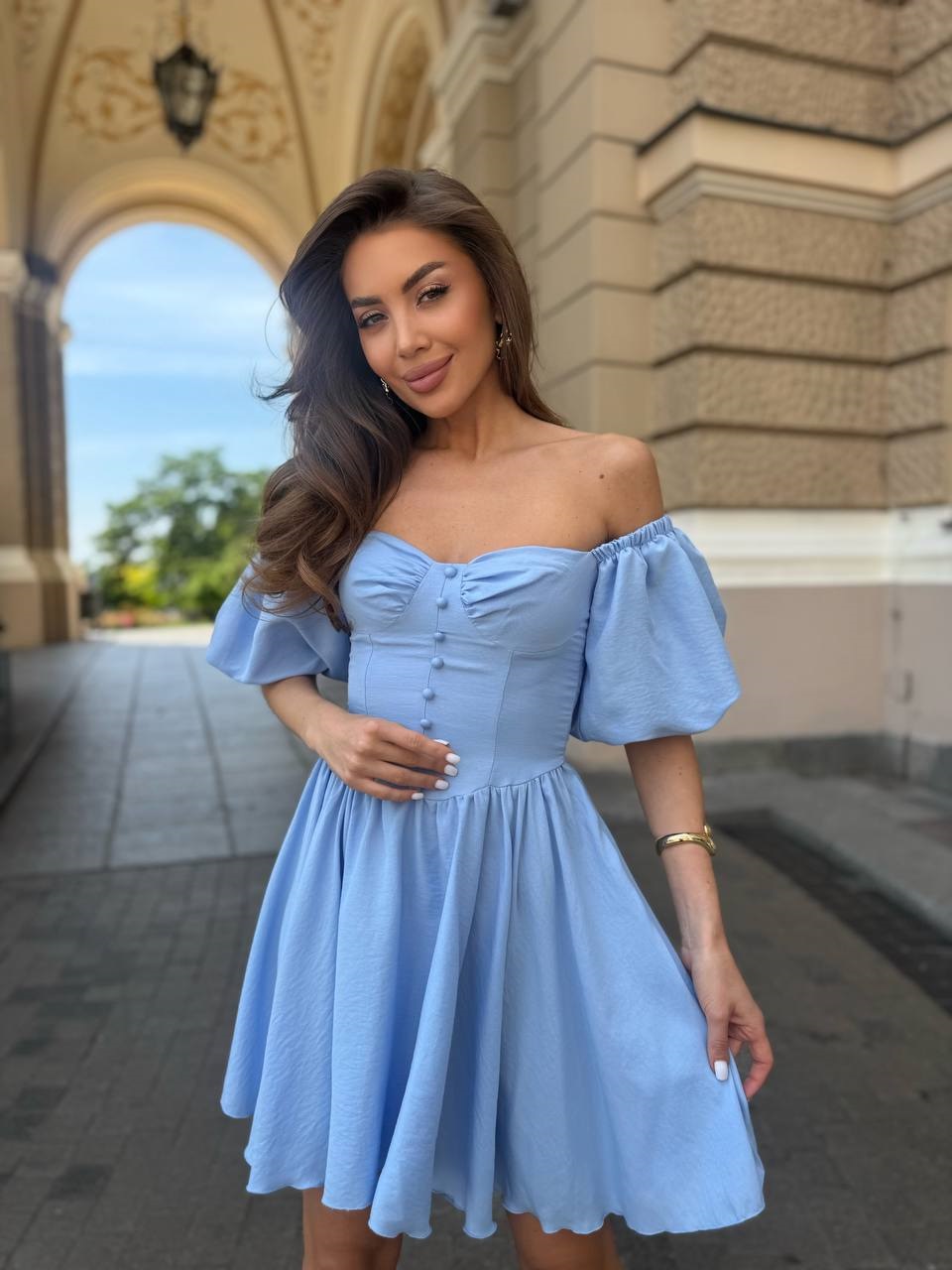 Легкое платье с открытыми плечами+объемным рукавчиком и пышной юбкой голубой
