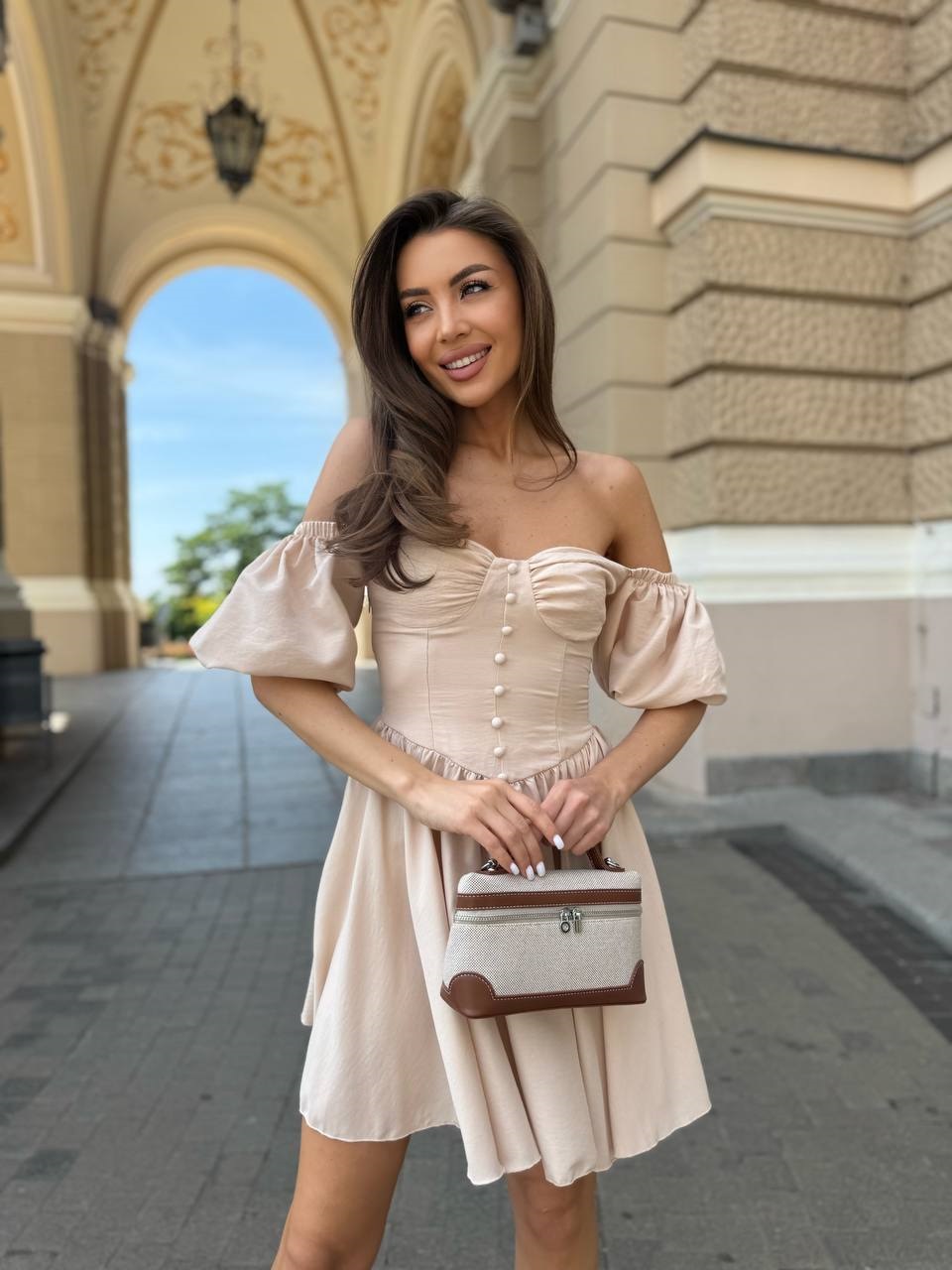 Легкое платье с открытыми плечами+объемным рукавчиком и пышной юбкой бежевый