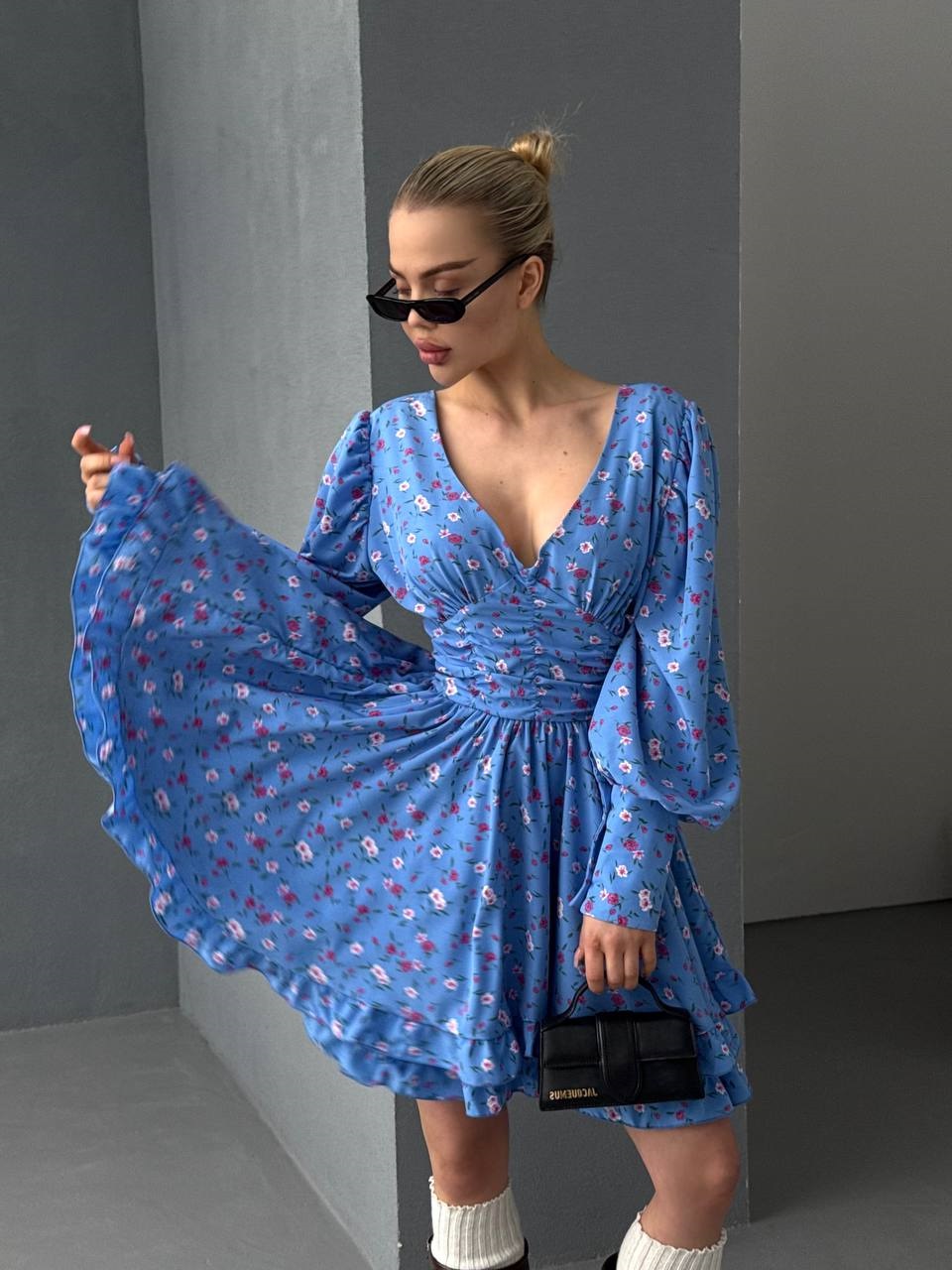 Легкое Платье с пышными рукавами+двойной юбкой солнце клеш с рюшами голубой
