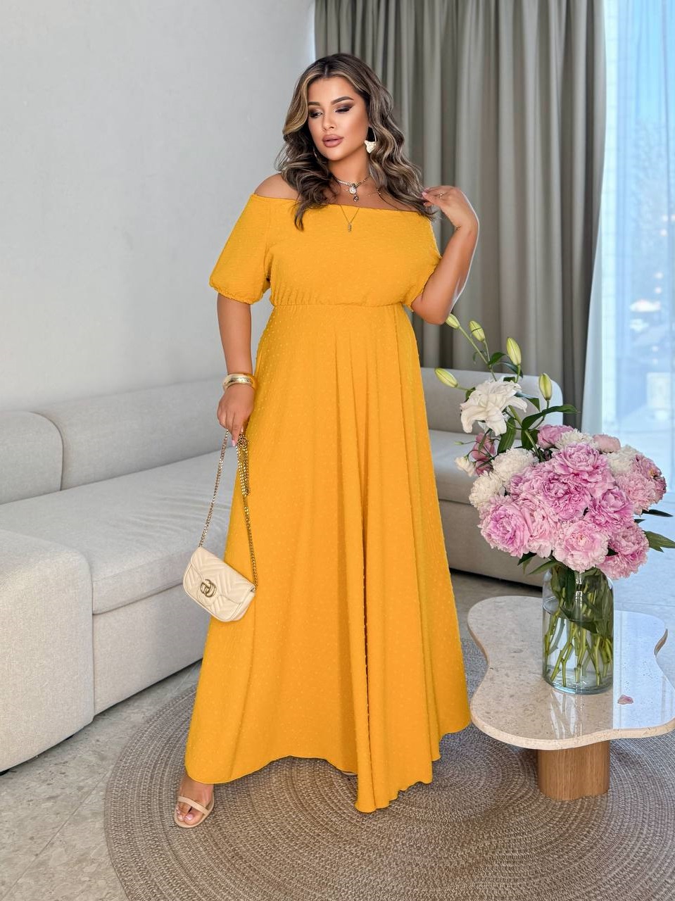 Легкое Платье с расклешенной юбкой+резинкой по горловине для открытых плеч длиной макси горчичный