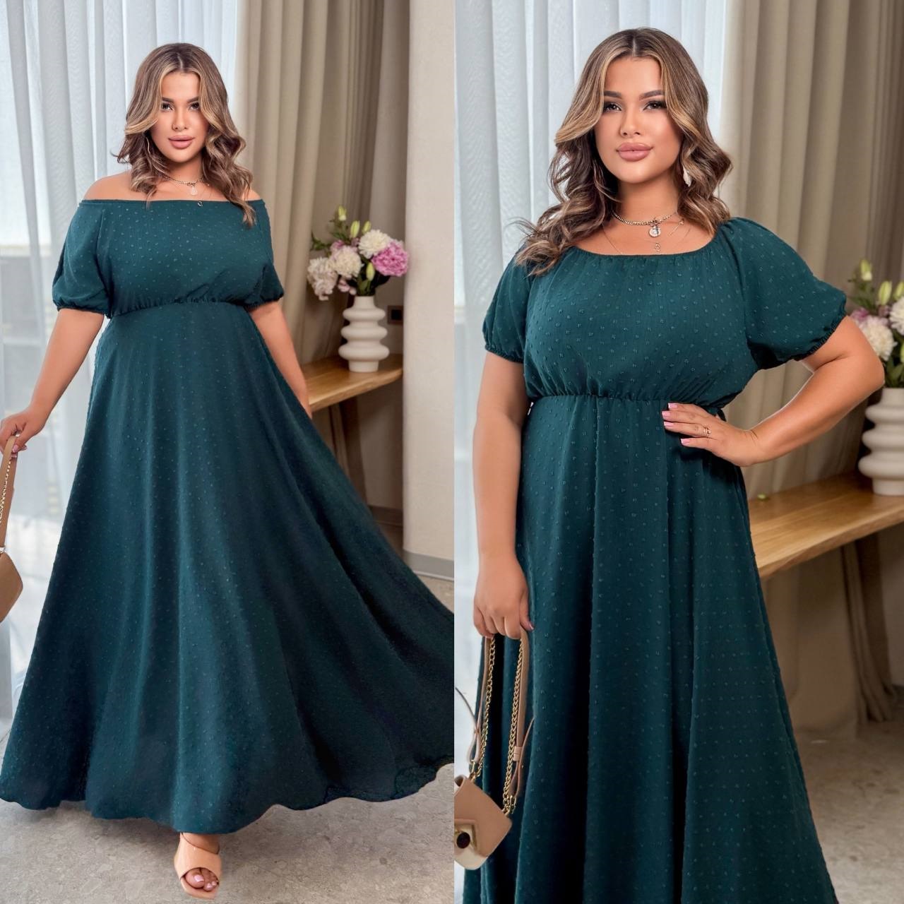 Легкое Платье с расклешенной юбкой+резинкой по горловине для открытых плеч длиной макси изумруд