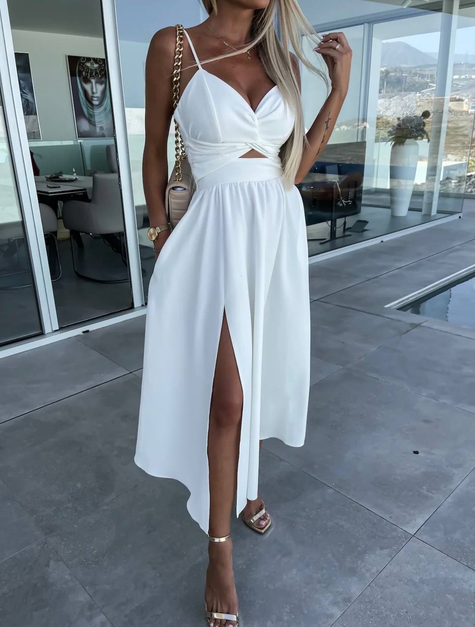 Летнее нежное платье с оригинальным кроем полочки+юбка с разрезом молочный