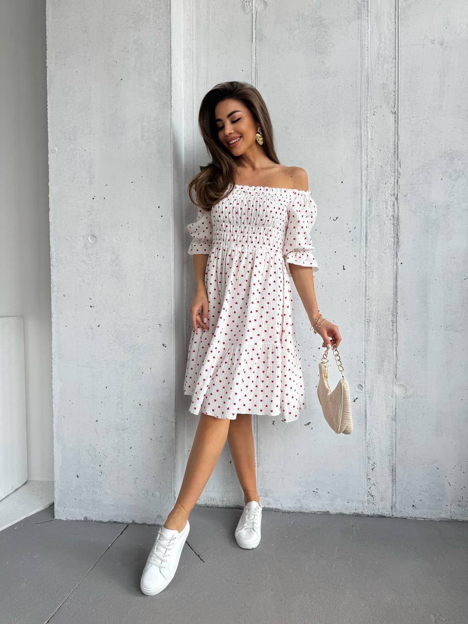 Длина до колена. На груди резинка .Можно одевать со спущенными и с приподнятыми плечиками