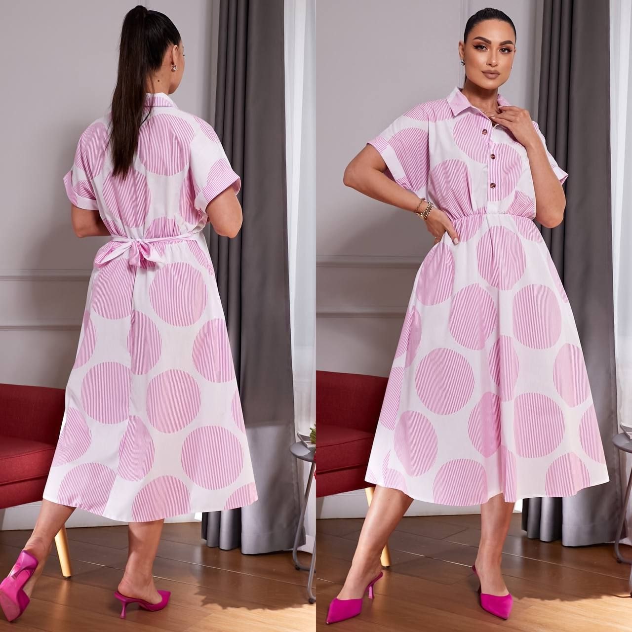 Летнее платье с карманами+по талии кулиска с резинкой длиной миди принт кружки розовый