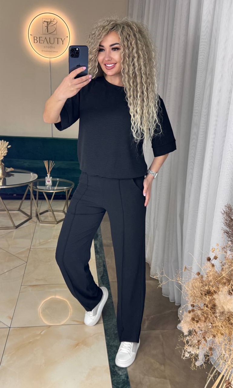 Летний костюм из креп жатки (кофта с кулиской по низу+брюки со стрелками) черный
