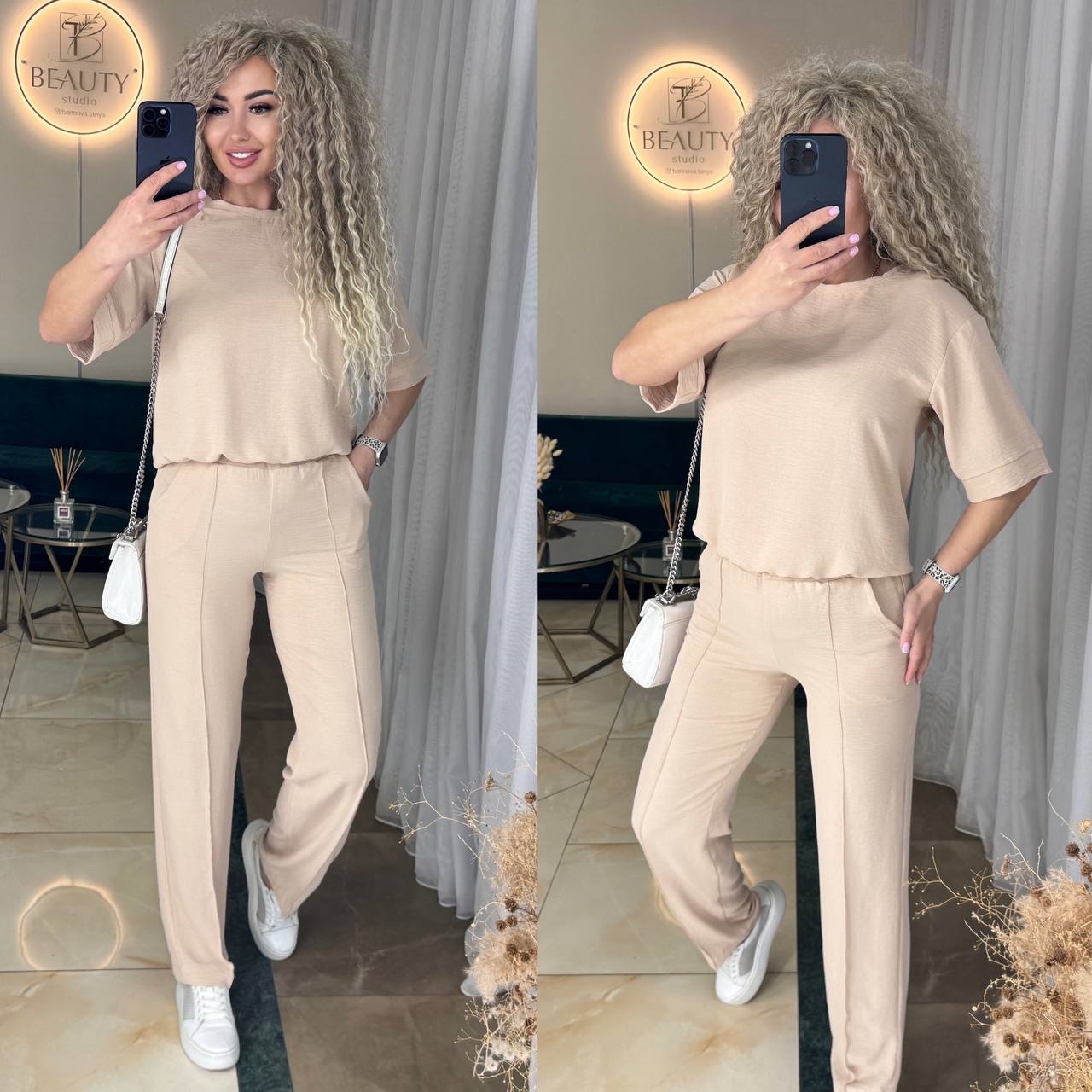 Летний костюм из креп жатки (кофта с кулиской по низу+брюки со стрелками) бежевый