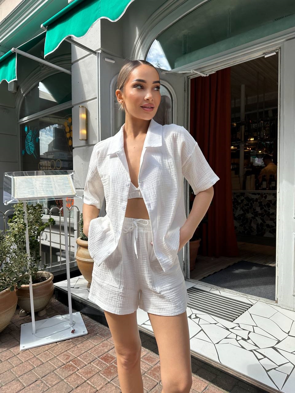 Головна » Магазин » ОДЕЖДА » ЖЕНСКИЕ КОСТЮМЫ » Летний костюм из легкого муслина (топ+рубашка+шорты) молочный