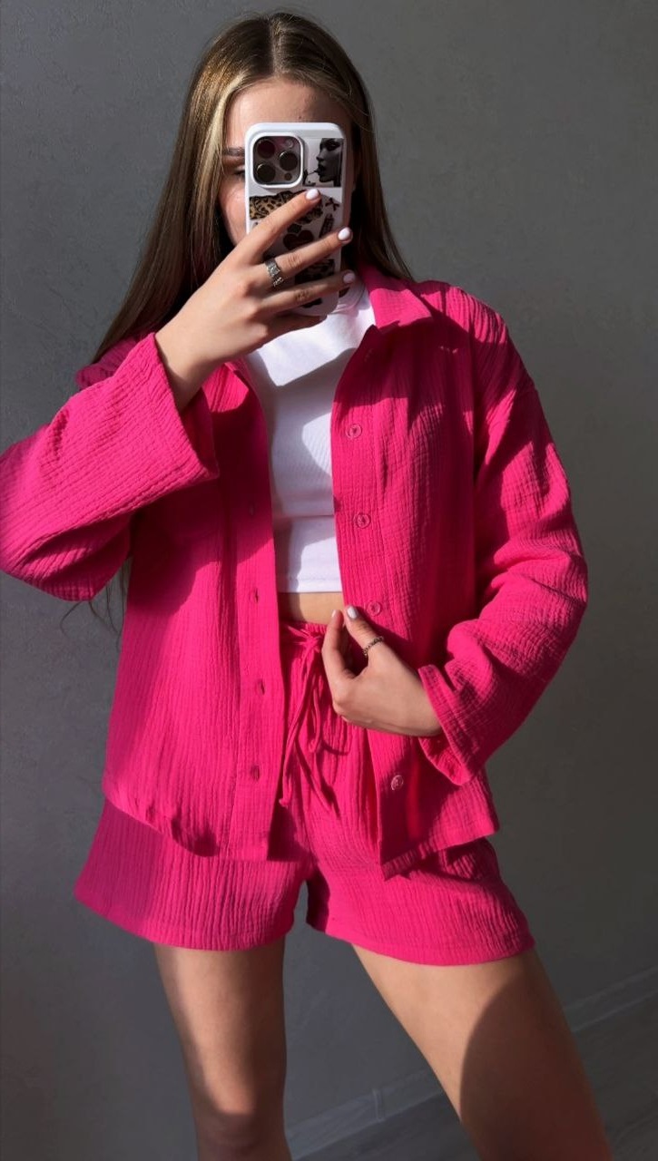 Летний костюм из муслина (шорты+рубашка с длинным рукавом) малина