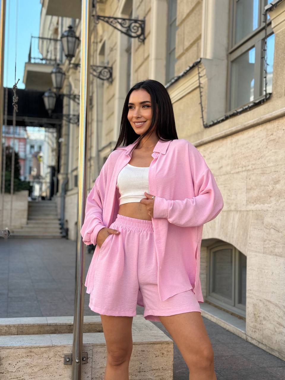 Летний костюм с креп жатки: рубашка свободная+шорты с поясом на резинке розовый