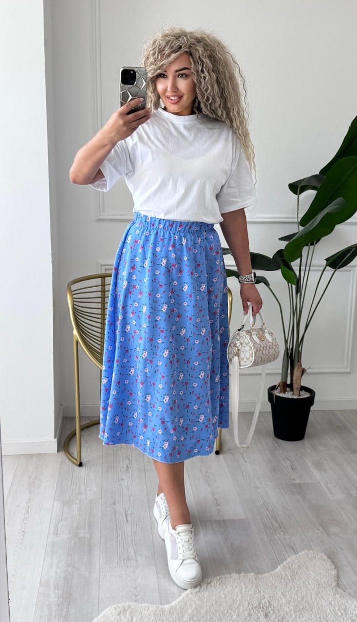 Летний костюм (шелковистая юбка в цветочный принт+белая футболка) голубой