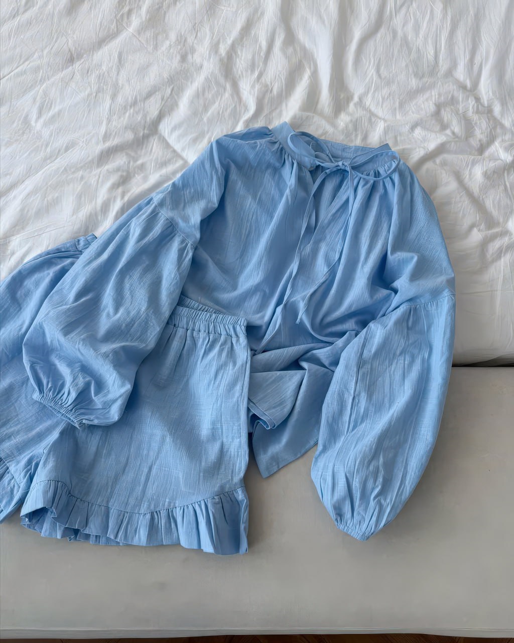 Стильный льняной костюм с нежными воланами – идеальный вариант для летних прогулок и отдыха.