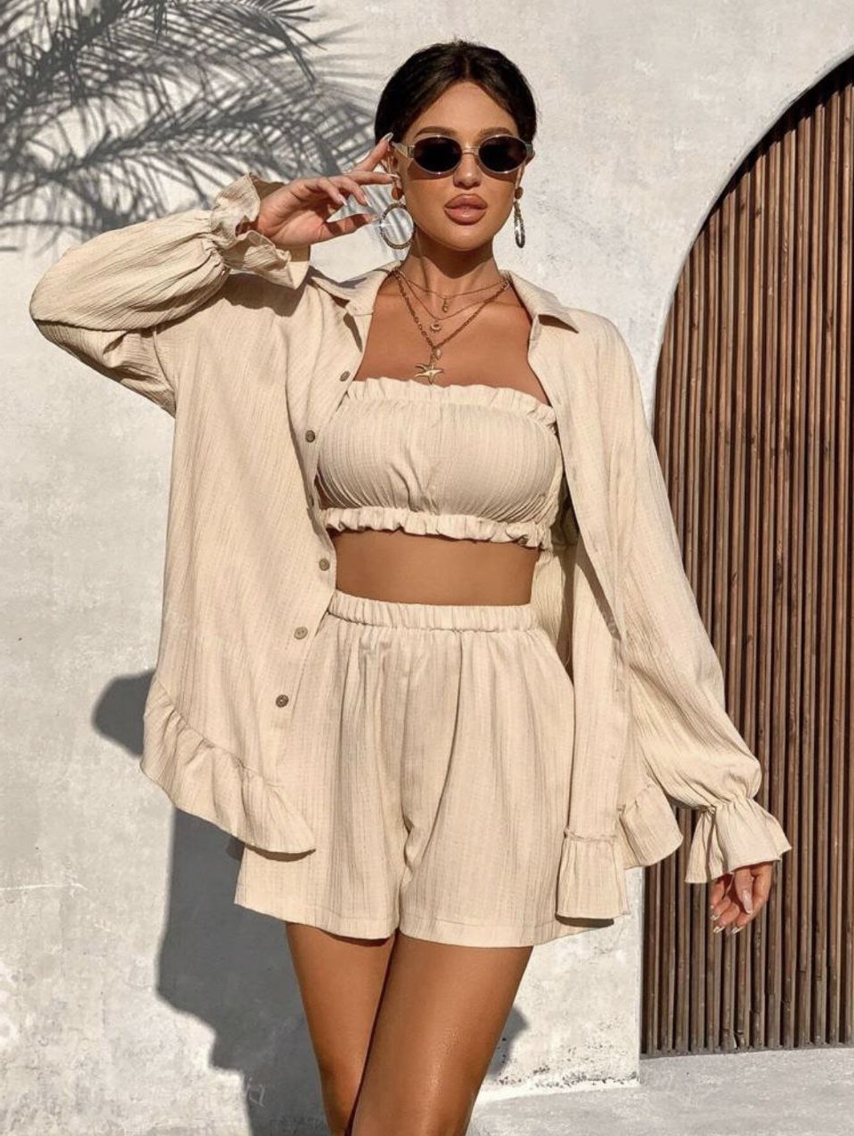 Летний костюм тройка (топ+рубашка с длинным рукавом+оборочкой по низу+шорты) бежевый