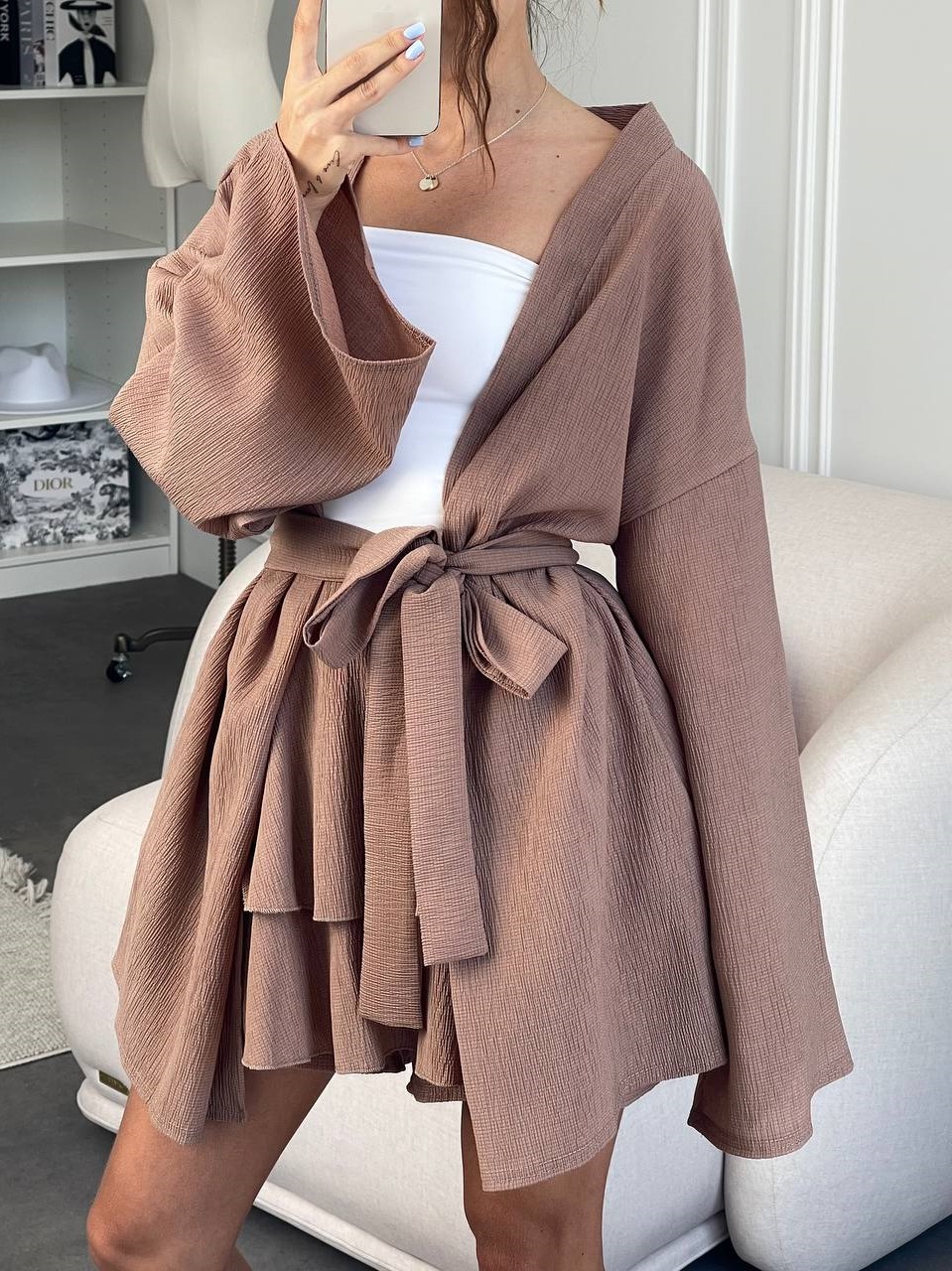Летний Костюм жатка (удлиненный кимоно с поясом+шорты-юбка) кофейный