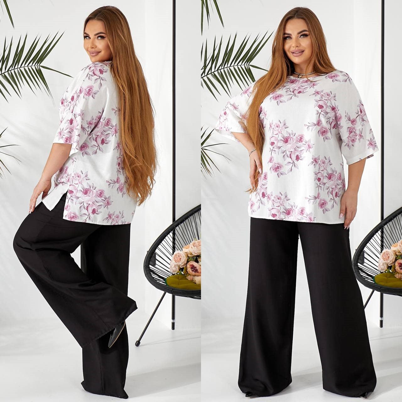 Льняной костюм (кофта свободного кроя в цветочный принт+брюки на резинке) пудра
