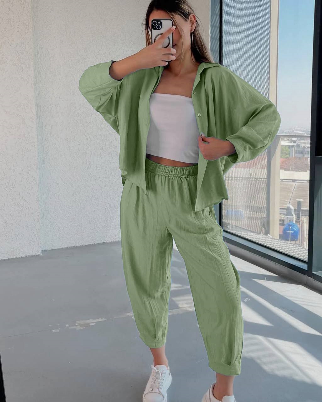 Льняной костюм (рубашка оверсайз+брюки с манжетой по низу) олива