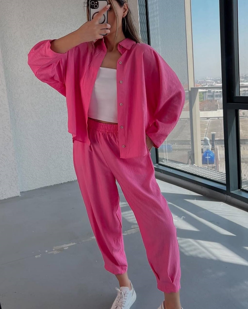Будьте первым, кто оставил отзыв на “Льняной костюм (рубашка оверсайз+брюки с манжетой по низу) розовый”