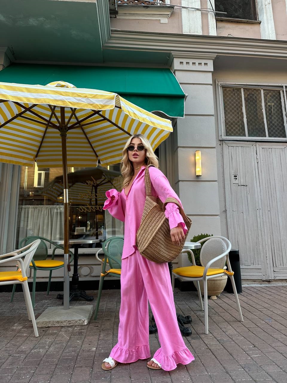 Головна » Магазин » ОДЕЖДА » ЖЕНСКИЕ КОСТЮМЫ » Льняной костюм с воланчиками свободного кроя (рубашка+брюки) розовый