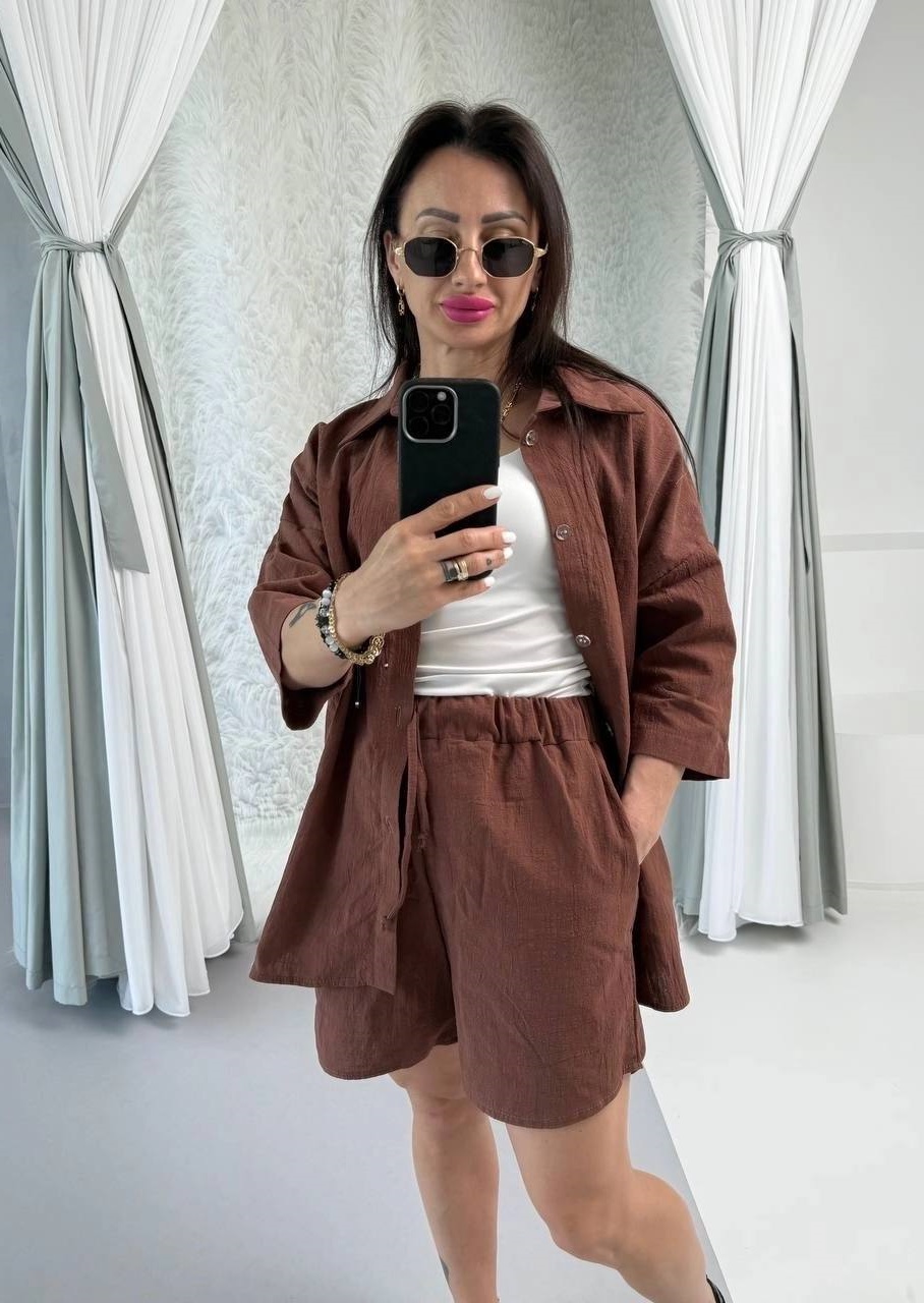 Головна » Магазин » ОДЕЖДА » ЖЕНСКИЕ КОСТЮМЫ » Льняной костюм (свободного кроя шорты+рубашка) шоколад