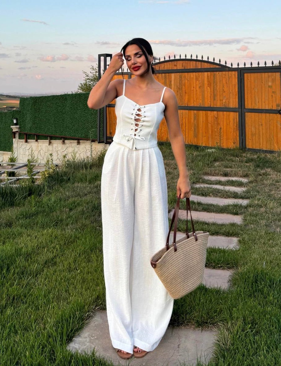 Головна » Магазин » ОДЕЖДА » ЖЕНСКИЕ КОСТЮМЫ » Льняной костюм (топ на бретелях со шнуровкой+свободного кроя брюки) белый