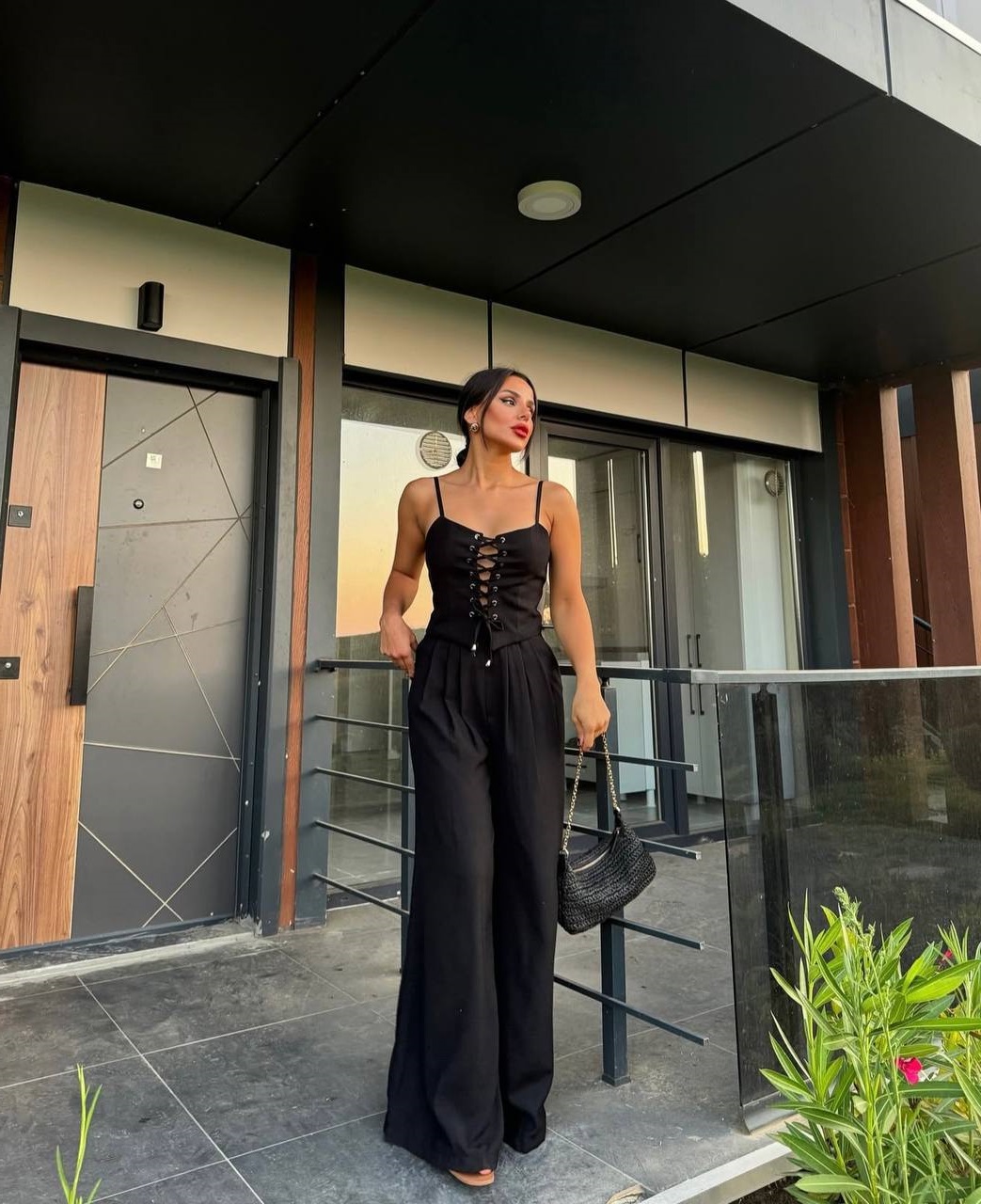Головна » Магазин » ОДЕЖДА » ЖЕНСКИЕ КОСТЮМЫ » Льняной костюм (топ на бретелях со шнуровкой+свободного кроя брюки) черный