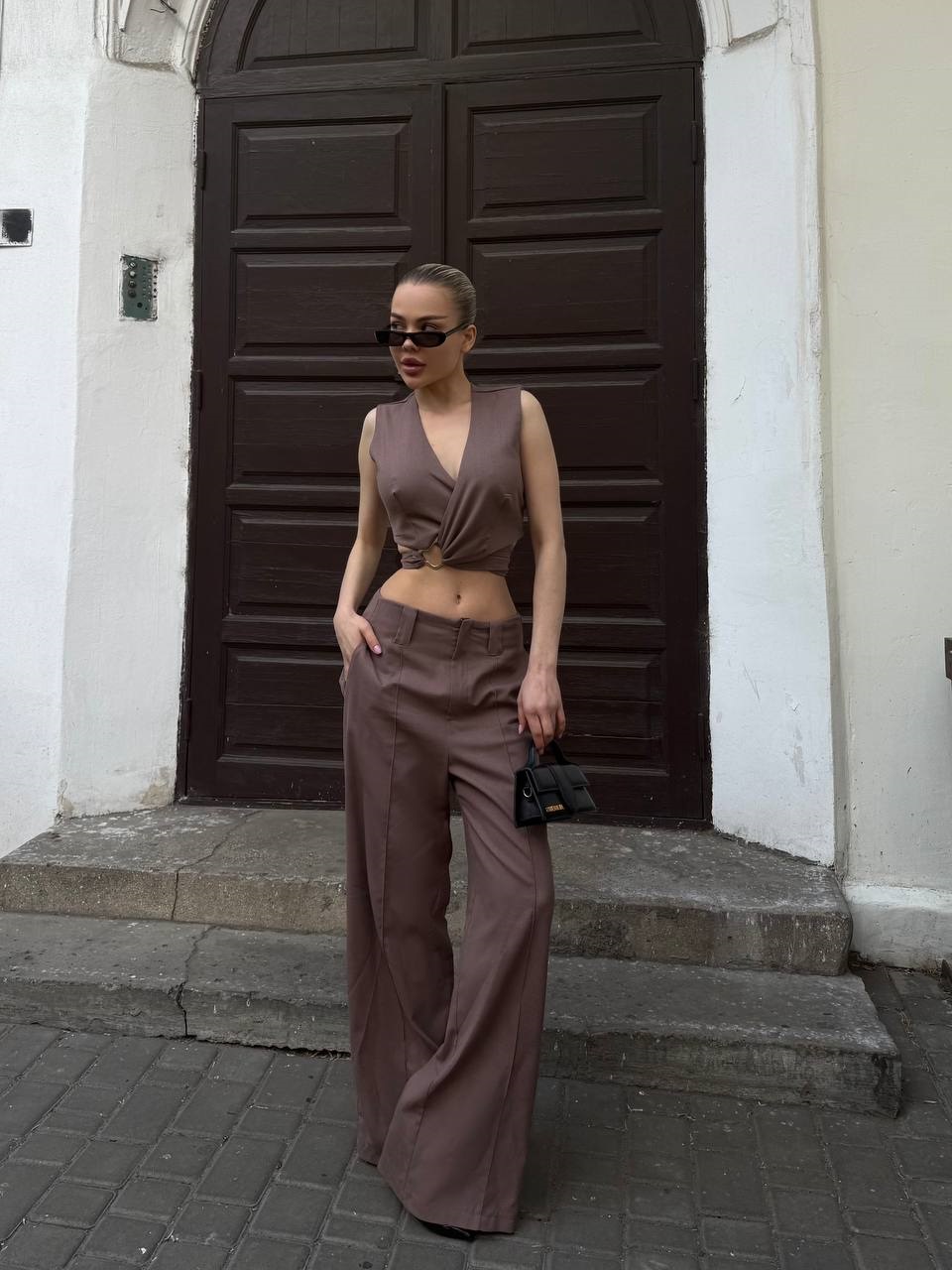 Льняной костюм (укороченный жилет+свободного кроя брюки) мокко