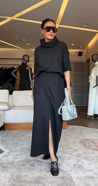 В комплект входит туника с высоким воротником и юбкам с разрезом, что создает легкий и непринужденный силуэт.