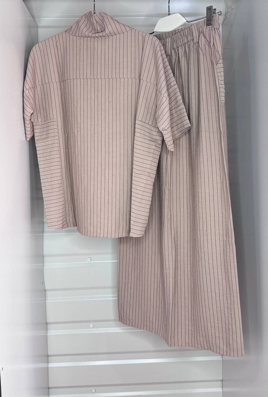 Льняной костюм в полоску (туника с высокой горловиной+юбка прямого кроя с разрезом) бежевый