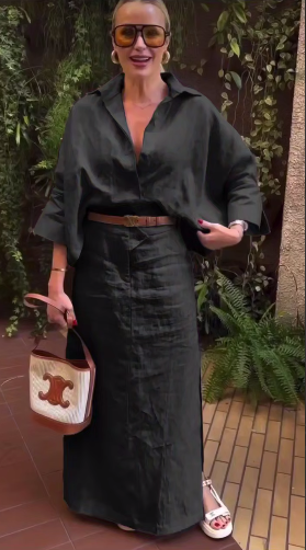 Головна » Магазин » ОДЕЖДА » ЖЕНСКИЕ КОСТЮМЫ » Льняной костюм (юбка с разрезом длиной макси+рубашка) черный