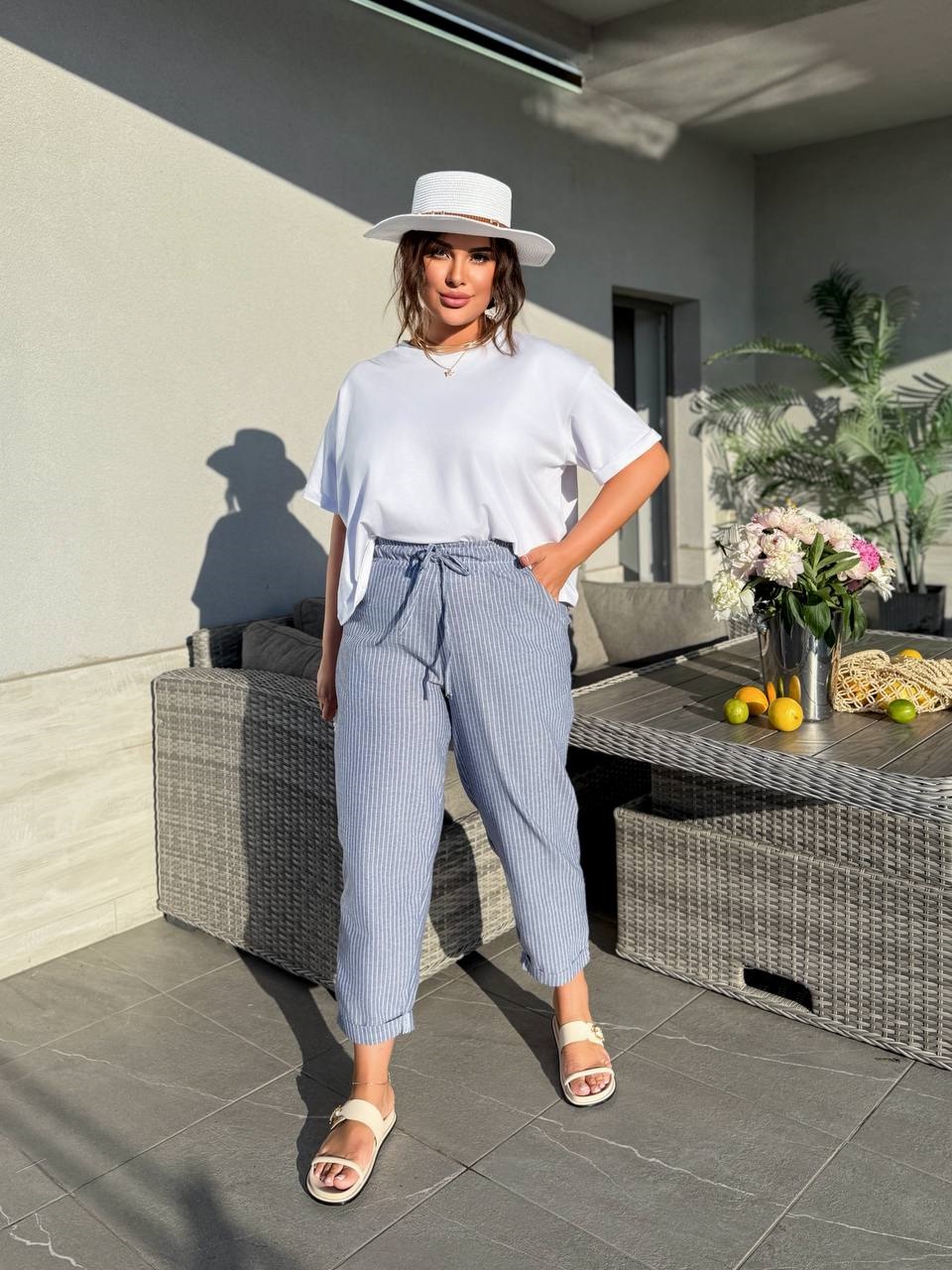 Льняные брюки-бананы с карманами талия на резинке джинс в полоску
