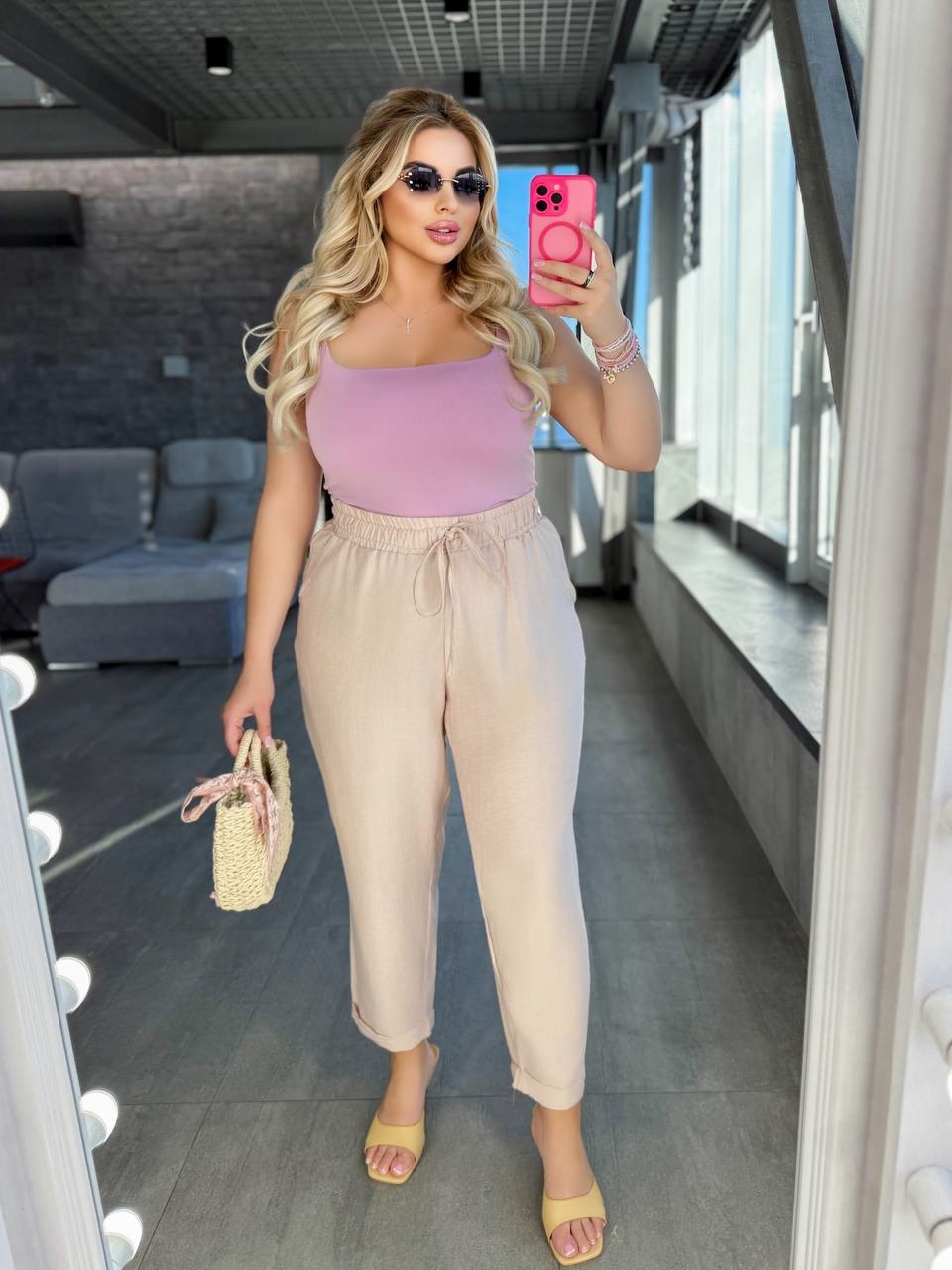 Льняные брюки-бананы с карманами талия на резинке бежевый